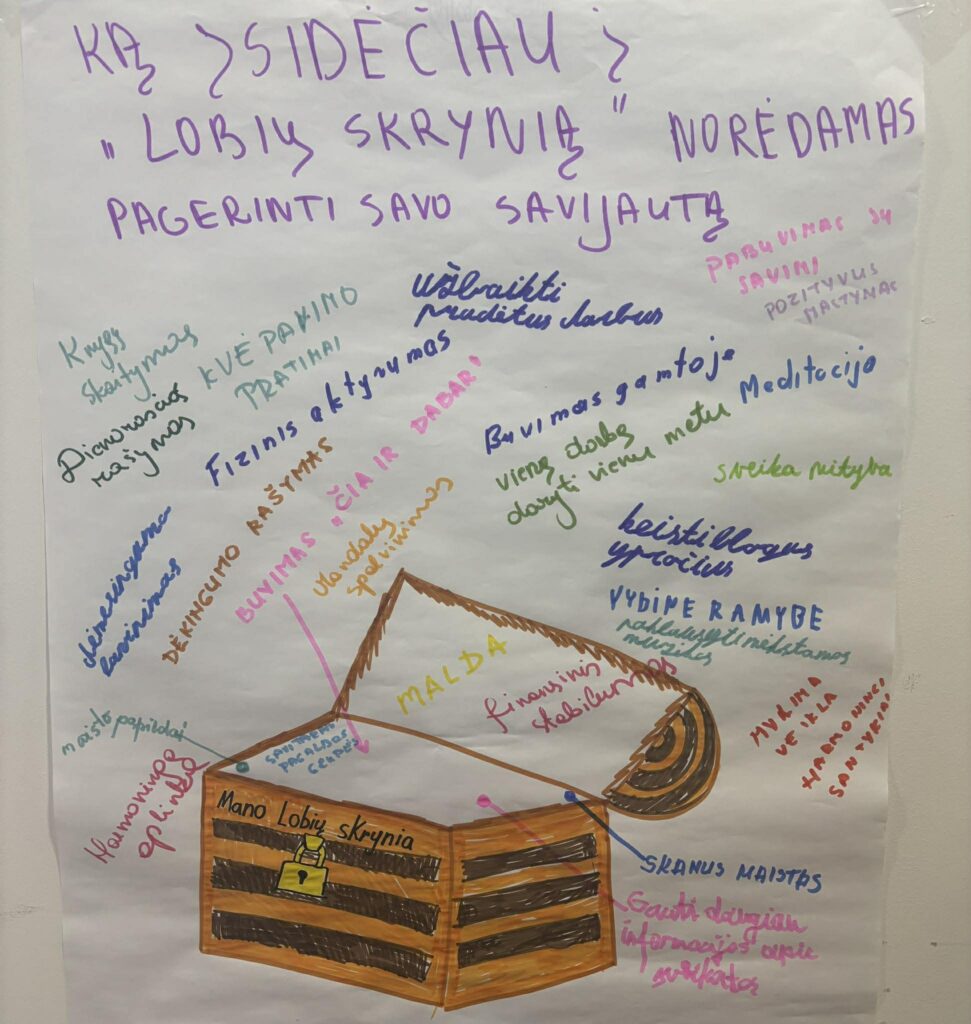 Aštuntajame susitikime dalyviai gilino finansinio raštingumo žinias: analizavo savo poreikius ir finansines galimybes, mokėsi taupymo būdų bei kėlė finansinius tikslus.